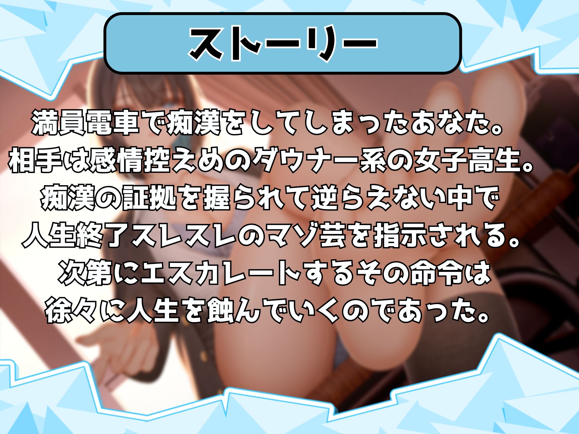 貴方は衝動的に朝の満員電車にて自分の前の前に立っていた女子高生に痴○をしてしまう。