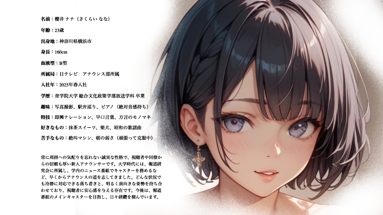 櫻井ナナは、常に周囲への気配りを忘れない誠実な性格で、視聴者や同僚からの信頼も厚い新人アナウンサーです。幼い頃からアナウンスの道を志してきました。純粋さを武器にニュースだけでなく、バラエティ番組でも自然体の魅力を発揮しています。