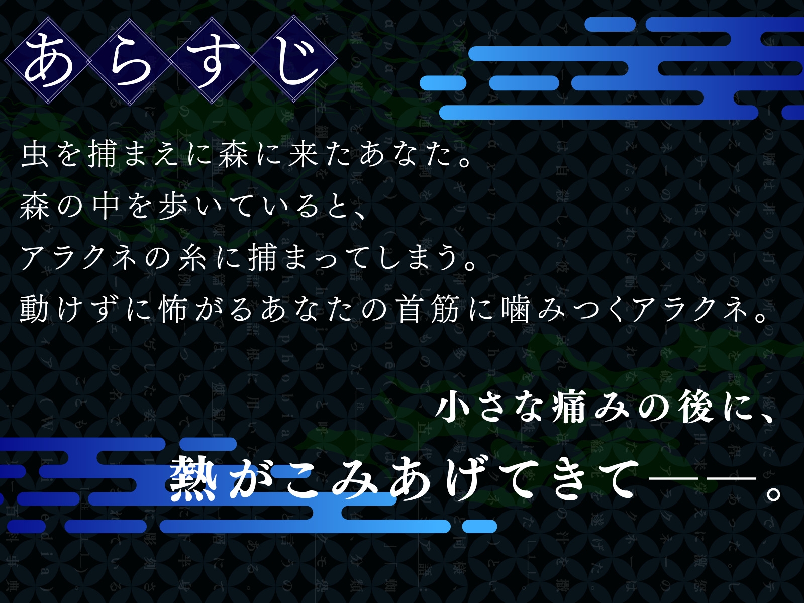 虫を捕まえに森に来たあなた。 森の中を歩いていると、アラクネの糸に捕まってしまう。 動けずに怖がるあなたの首筋に噛みつくアラクネ。 小さな痛みの後に、熱がこみあげてきて――。