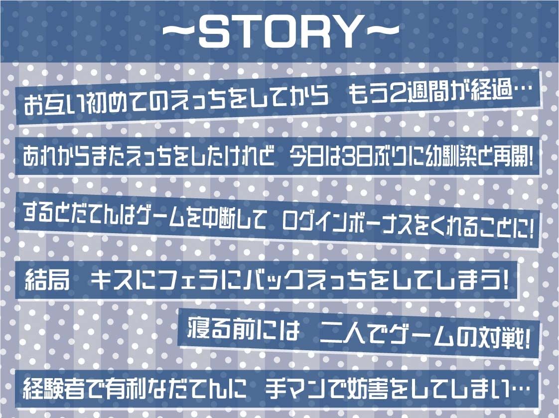 お互い初めての えっちをしてから もう2週間が経過… あれからまた えっちをしたけれど 今日は3日ぶりに 幼馴染と再開! するとだてんは ゲームを中断して ログインボーナスを くれることに! 結局キスにフェラに バックえっちをしてしまう! 寝る前には二人で ゲームの対戦! 経験者で有利なだてんに 手マンで妨害をしてしまい…