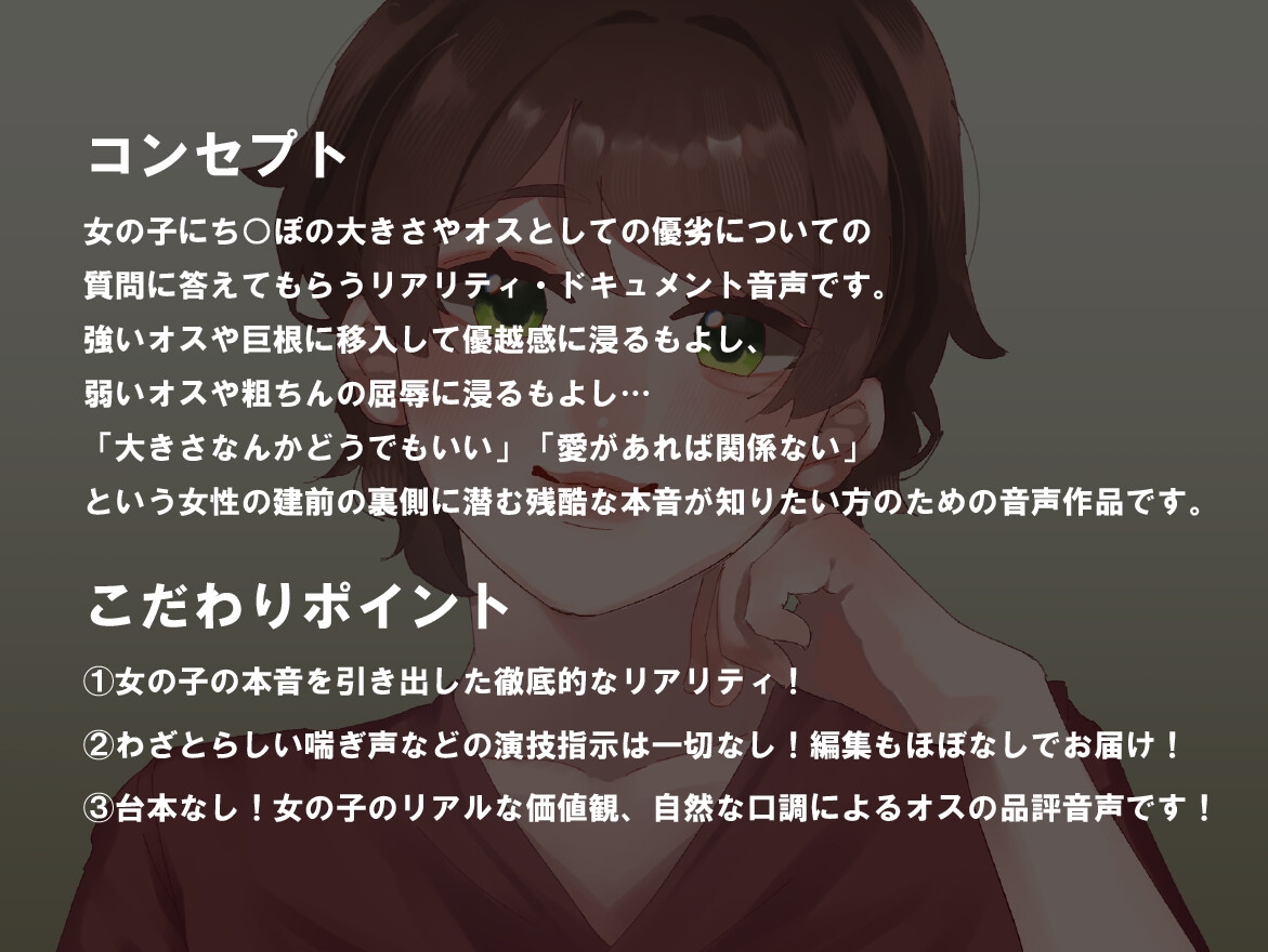「大きさなんかどうでもいい」「愛があれば関係ない」という女性の建前の裏側に潜む残酷な本音が知りたい方のための音声作品です。