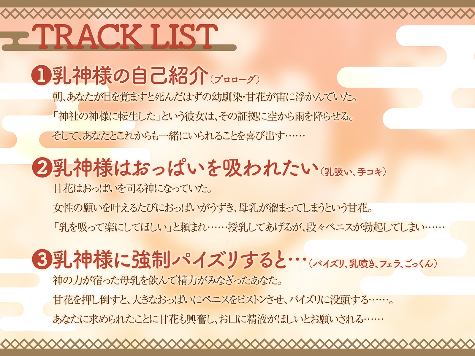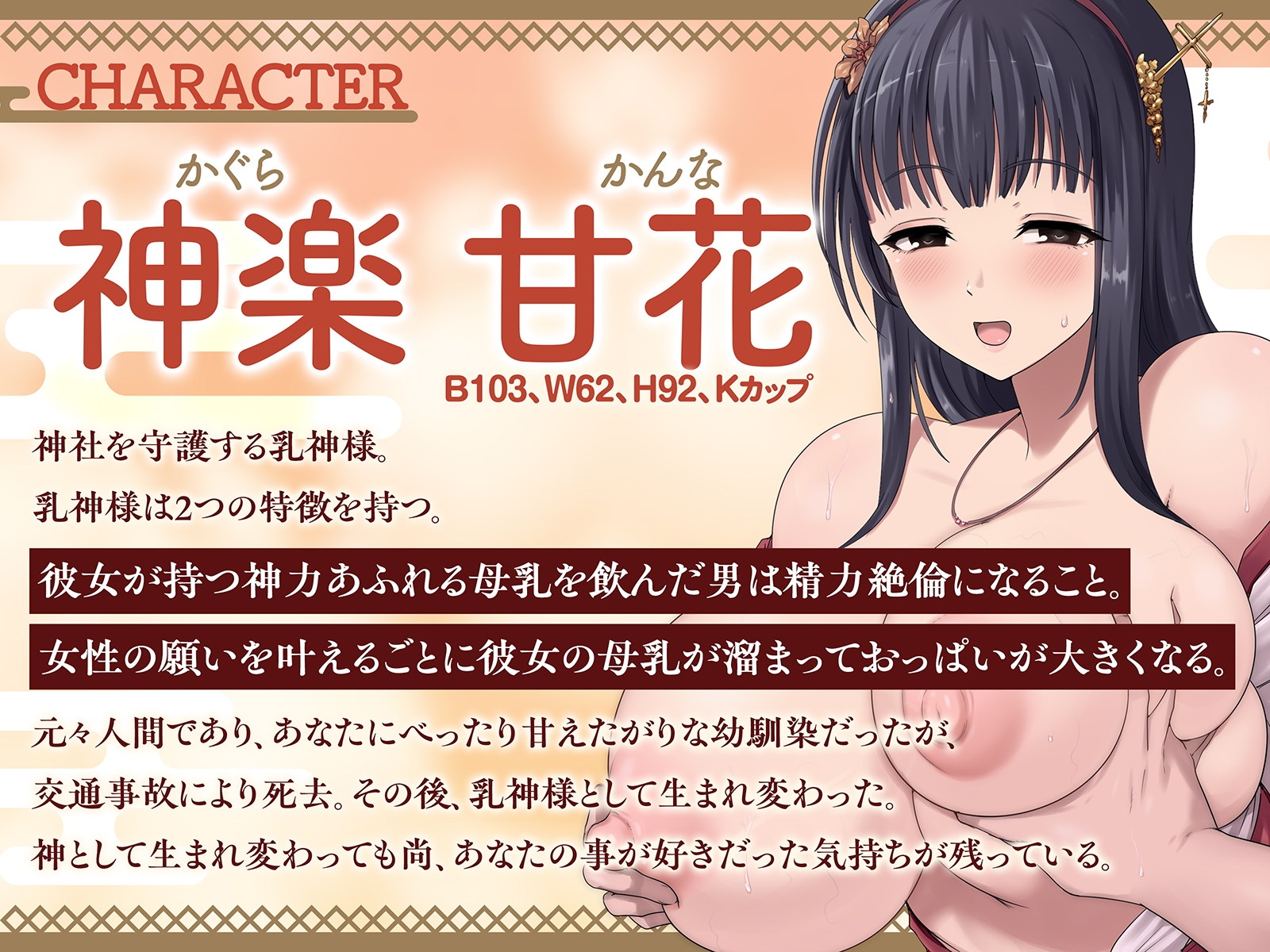 朝目を覚ますと、死んだ筈の幼馴染・甘花が宙に浮かんでいた。神様に転生したという彼女。そしてあなたとこれからも一緒にいられることを甘花は喜ぶ……。しかし彼女は、おっぱいの悩みを解決する”乳神”として生まれ変わっていた。乳神様である甘花のおっぱいは母乳が溜まってどんどん大きくなり、少し苦しそうな様子…。頼まれるまま母乳を吸い始めると……高まる彼女の神力とあなたの精力。乳神の力を使ったプレイで二人はどんどん乱れていく……
