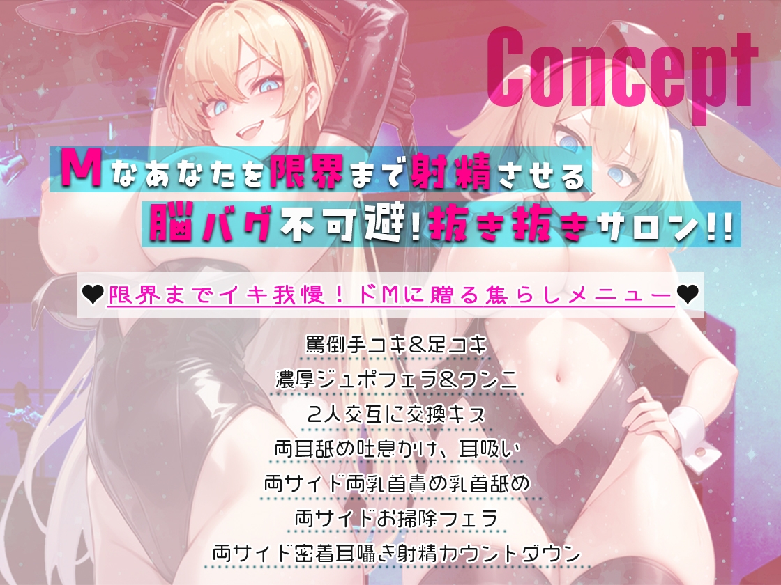 「電話してきたってことは…私達にちんぽ、イジメてもらいたいんでしょ?また、キツ~く、イジメてやるからね」Mなあなたの射精管理を手伝ってくれるのは、バニー姿の巨乳セクシーお姉さんと、ちんぽ大好き○リっ子の姉妹。両サイド密着耳元で囁き罵倒しながら手コキ、足コキ、フェラは序の口。寸止めで限界までとことん焦らしまくります。意地悪でドSな姉妹が最高に気持ちいい射精をあなたにお届け
