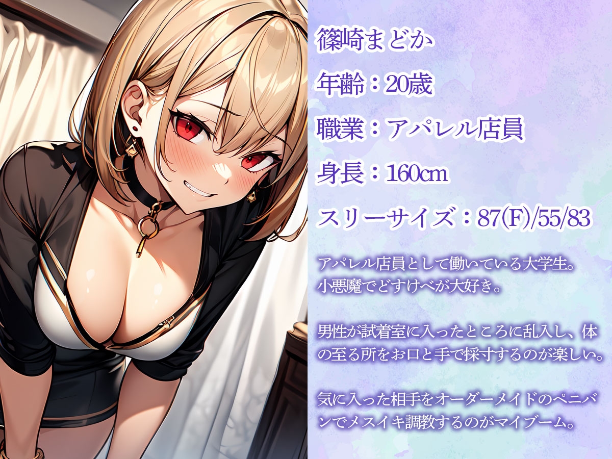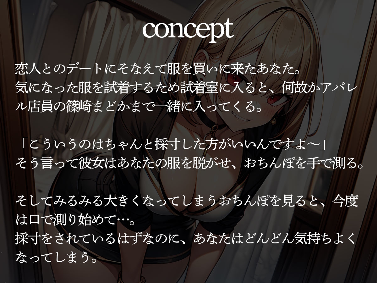 恋人とのデートにそなえて服を買いに来たあなた。気になった服を試着するため試着室に入ると、何故かアパレル店員の篠崎まどかまで一緒に入ってくる。「こういうのはちゃんと採寸した方がいいんですよ~」そう言って彼女はあなたの服を脱がせ、おちんぽを手で測る。そしてみるみる大きくなってしまうおちんぽを見ると、今度は口で測り始めて…。採寸をされているはずなのに、あなたはどんどん気持ちよくなってしまう。