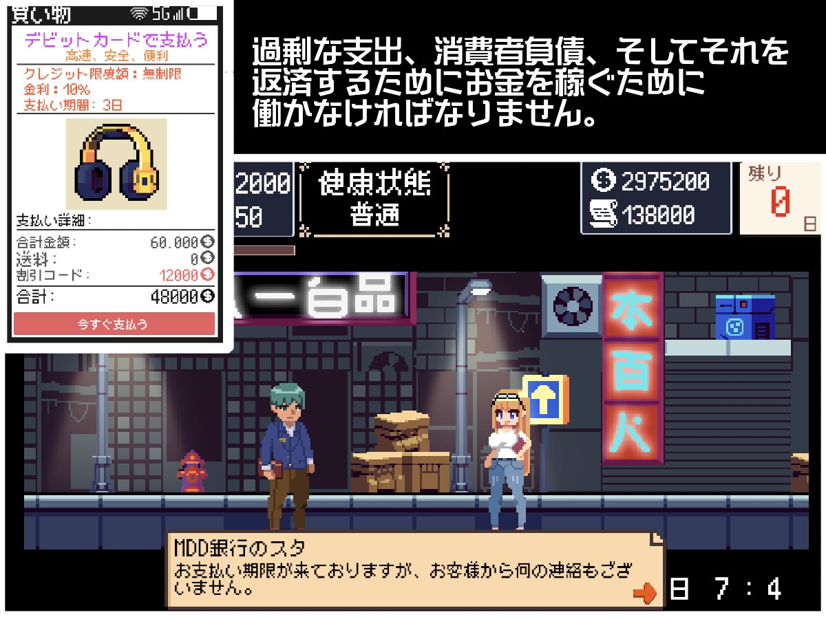 失業中は、物を買うためにお金を借りなければなりません。 仕事を見つけて、借金を返済するために一生懸命働かなければなりません。 仕事を完了しないと罰せられます(H画面)