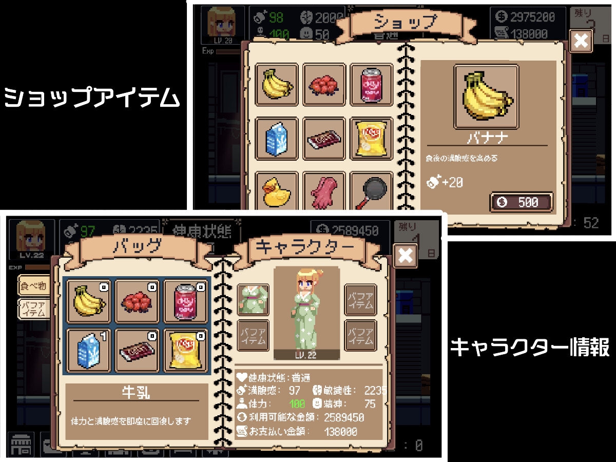 ショップシステムとキャラクター装備で気軽にゲームを楽しめる