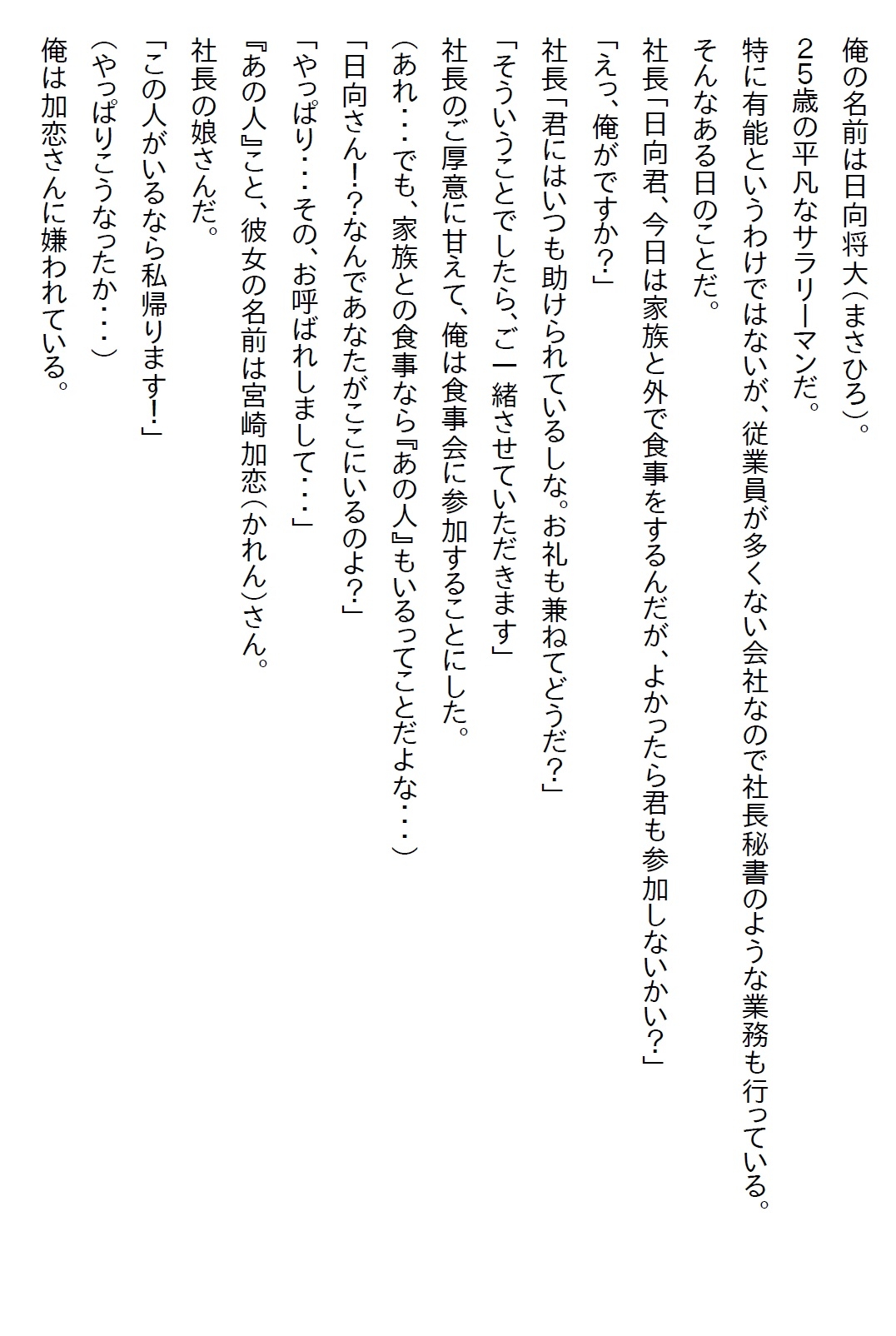 主人公・日向将大は普通のサラリーマンであるが、社員が少なくて社長秘書の役割も担っている。そんな将大に社長は家族での外食に誘う。日頃の仕事の労いということで、ついていくことにした。ただ、お店に着いて社長令嬢である宮崎加恋がいることを思い出した。数年前の会社創設パーティーで、将大が加恋にワインをこぼしてから嫌われているのだ。雰囲気が悪くなり二人とも帰ろうとすると、社長は将大と加恋のお見合いの席だと言い始めたのである。