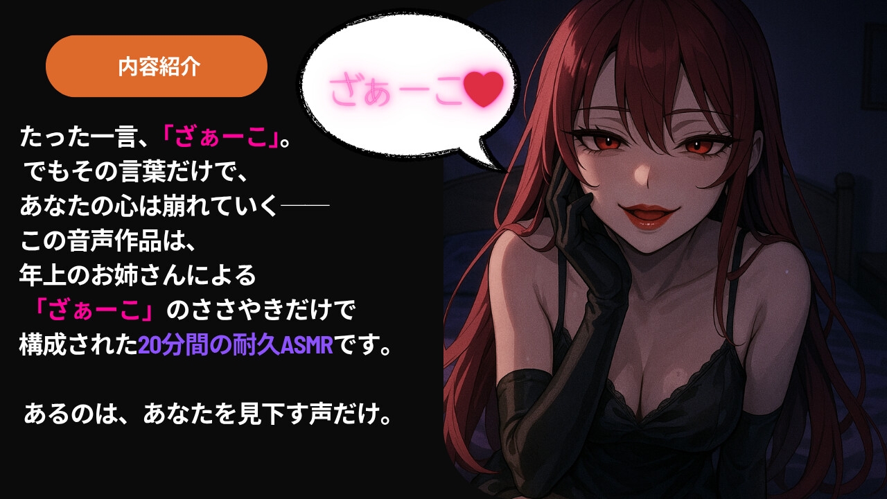 ただ「ざぁーこ」と囁かれるだけ──それなのに、心が支配される。 言葉は一つ、でも逃げられない。耳に残り、脳が溶ける。 これは“聞き流せない”シンプルASMR。