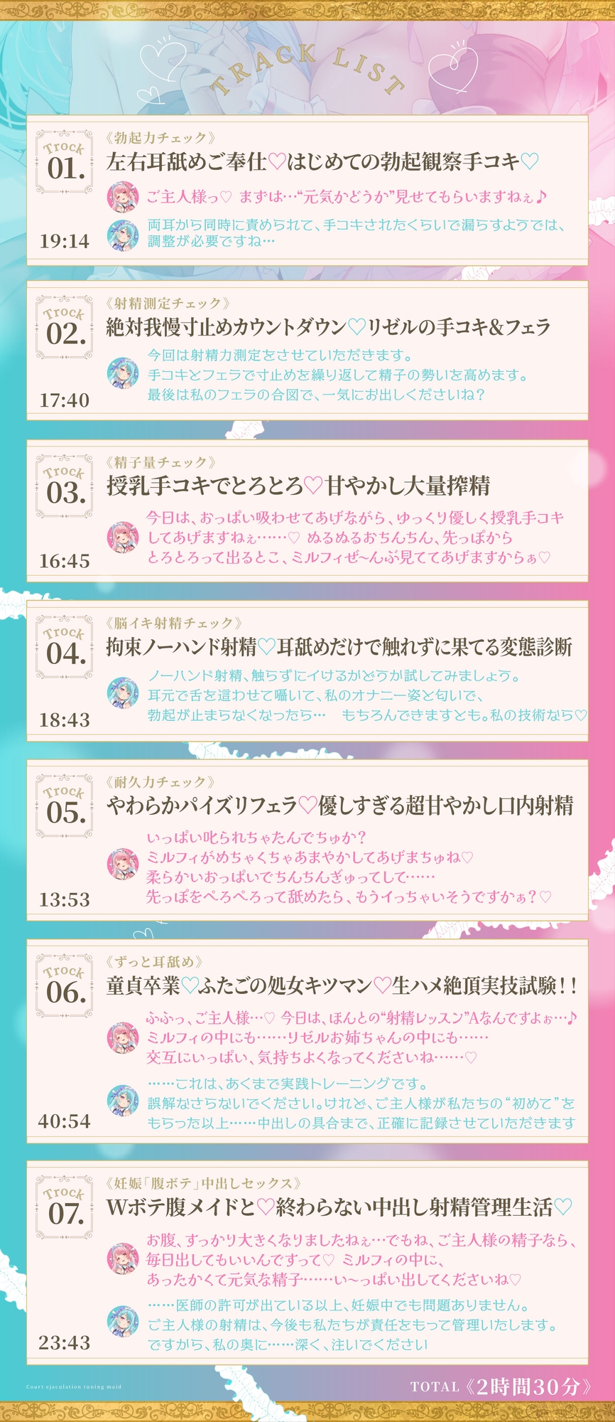 「見た目は一緒 違う快感」 究極の双子射精管理 双子姉妹による逃れられない射精管理 毎日手を変え品を変え搾り取られちゃう性癖調律射精管理! 両耳穴ぐぽぐぽ耳舐め(リ・ミ) 罵倒寸止め辱めフェラ(リ) あまあま授乳手コキ(ミ) ノーハンド脳イキ射精(リ) 巨乳パイズリフェラ etc… あまりの気持ちよさに勃起&射精が止まらない…♡ 双子に徹底管理されたい方にオススメです♪