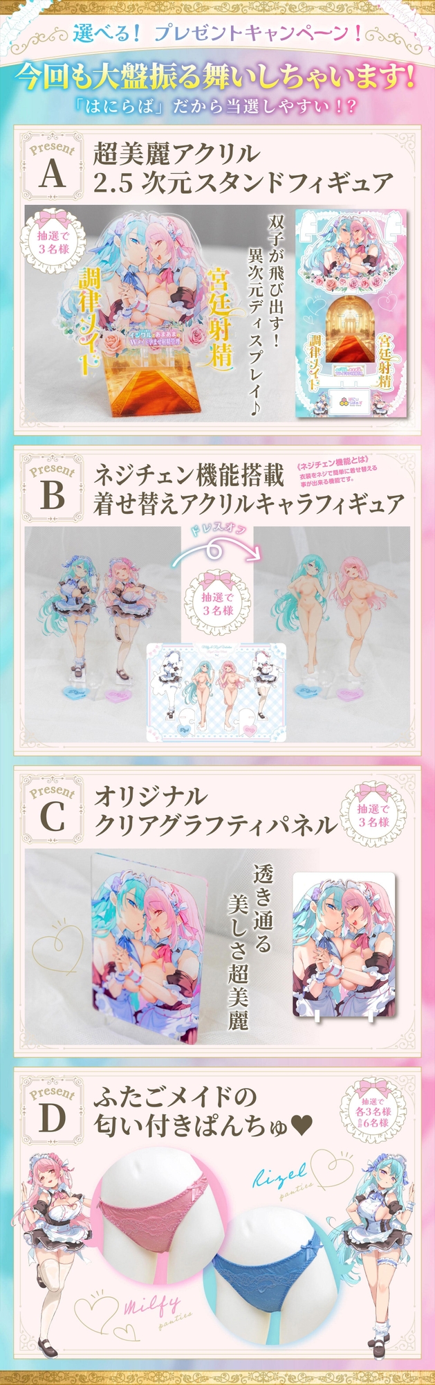 | タグ | 双子 メイド ラブラブ/あまあま 赤ちゃんプレイ 妊娠/孕ませ フェラチオ 言葉責め 耳舐め |