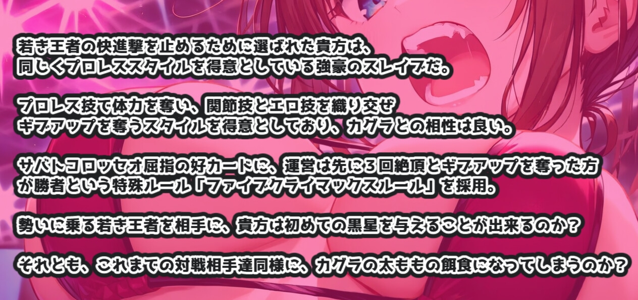 若き王者の快進撃を止めるために選ばれた貴方は、関節技とエロ技を織り交ぜ ギブアップを奪うスタイルを得意としており、相性は良い。 サバトコロッセオ屈指の好カードに、運営は先に3回絶頂とギブアップを 奪った方が勝者という特殊ルール「ファイブクライマックスルール」を採用。 勢いに乗る若き王者を相手に、 貴方は初めての黒星を与えることが出来るのか? それともこれまでの対戦相手達同様にカグラの太ももの餌食になってしまうのか?
