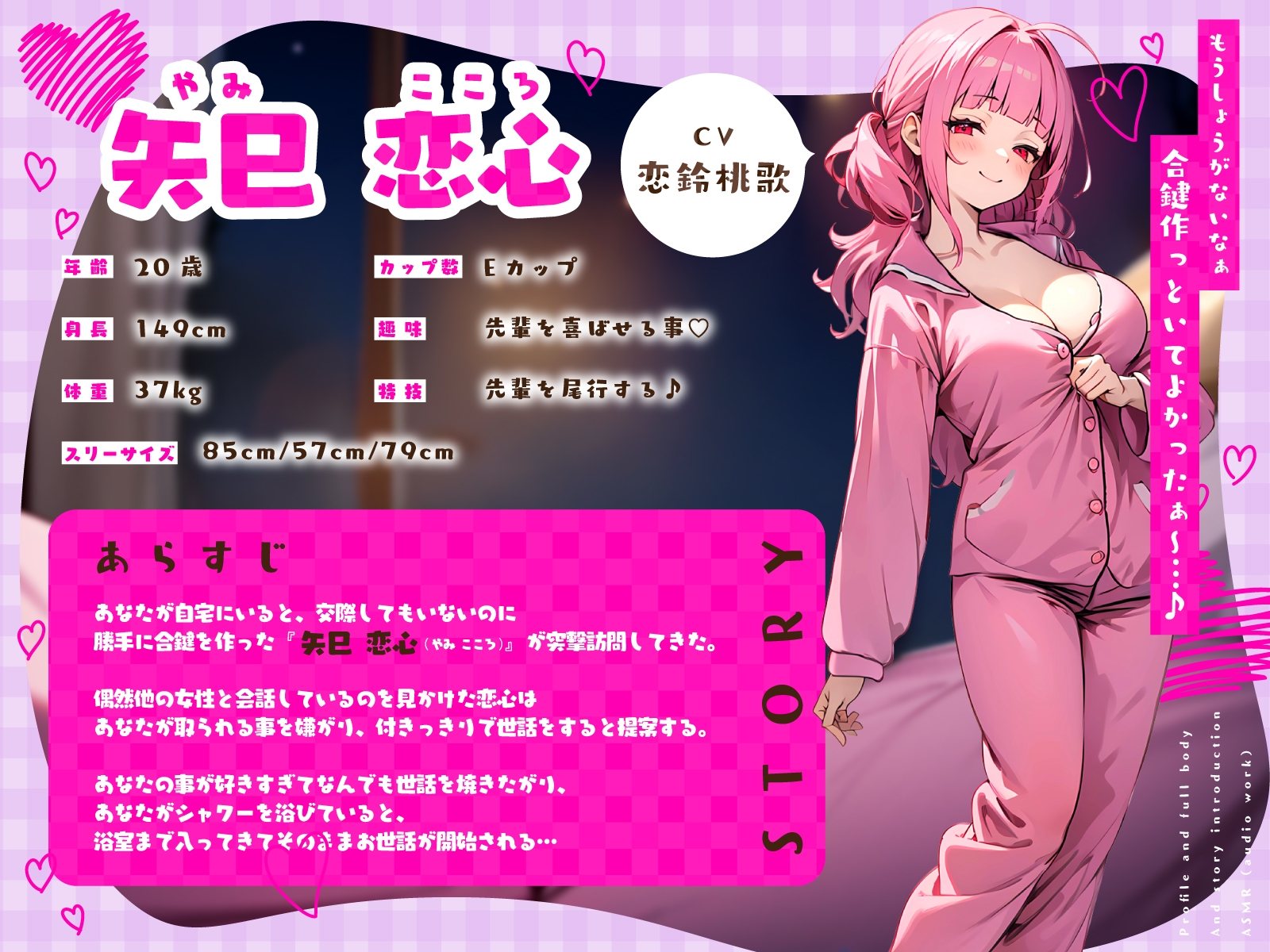 交際もしていないのに合鍵で押しかけてきた『矢巳 恋心(やみ こころ)』。他の女性と話す姿に嫉妬し、あなたに付きっきりで世話をすると宣言。シャワー中のあなたのもとへも押しかけ、恋心の“お世話”が始まってしまう…。