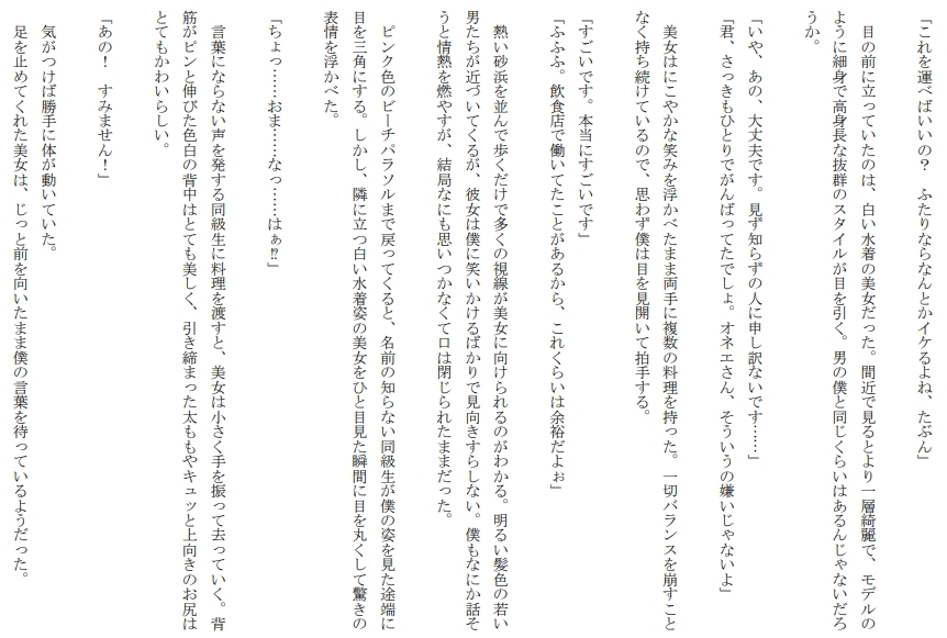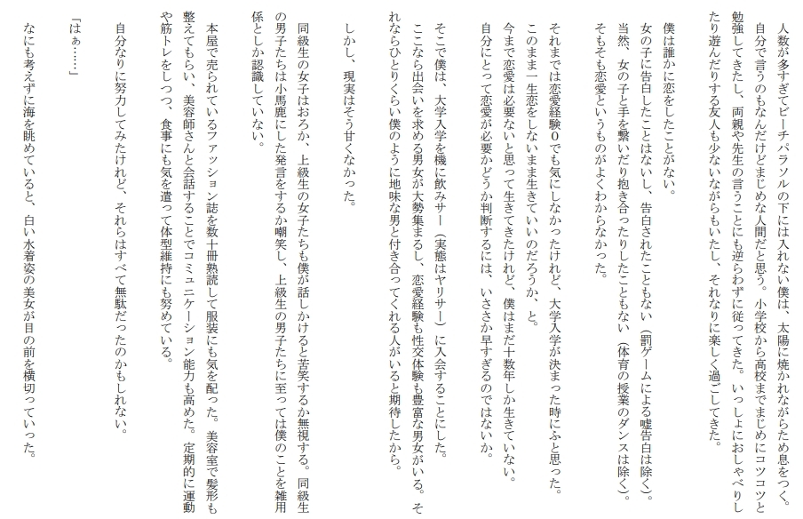 地味でまじめな男子大学生(主人公)は、夏の海水浴場でサークルの先輩たちにパシリをさせられていた。