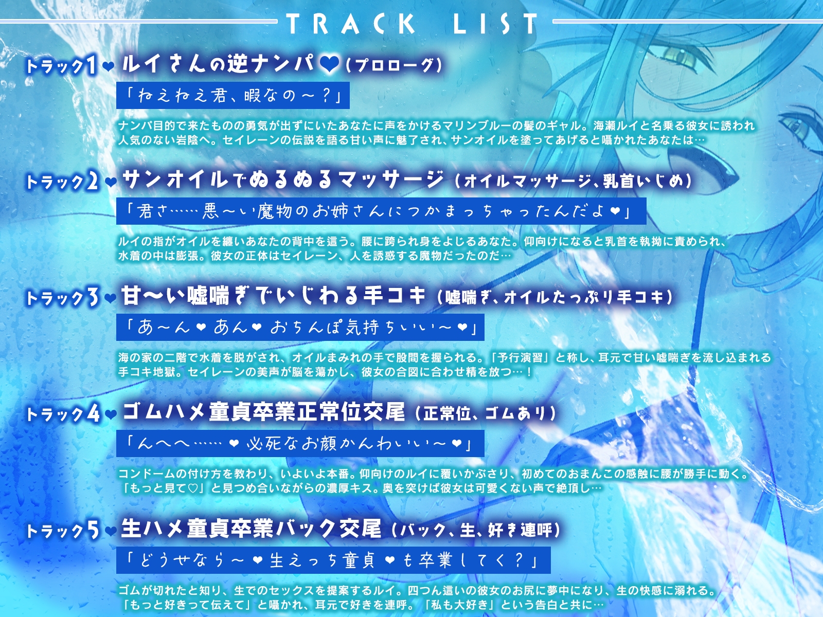 「ねえねえ君、暇なの~?」――彼女を作るためビーチに来たあなたを誘ったのは、マリンブルーの髪と妖艶な曲線美を持つギャル。海瀬ルイと名乗る彼女の甘い囁きに魅了され気づけば秘密の場所へ。ぬるぬるオイルで全身を撫でられ、乳首を弄ばれ、彼女の正体が人を誘惑する魔物「セイレーン」だと知った時にはもう遅かった。童貞を奪われ、生ハメまでされた果てに彼女からの告白。魔性の快楽に溺れるあなたの運命は…