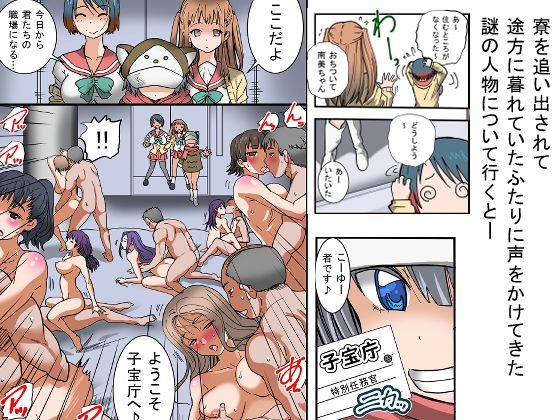 ”子宝庁”に連れてこられたふたりは救済と引き換えに出生率の向上に協力しろと言われるのだが、そこは乱交がメインであり、機械で孕ませ、羞恥心の排泄やフタナリ化など、出生率を上げる為なら何でもありのトンデモ施設だった。
