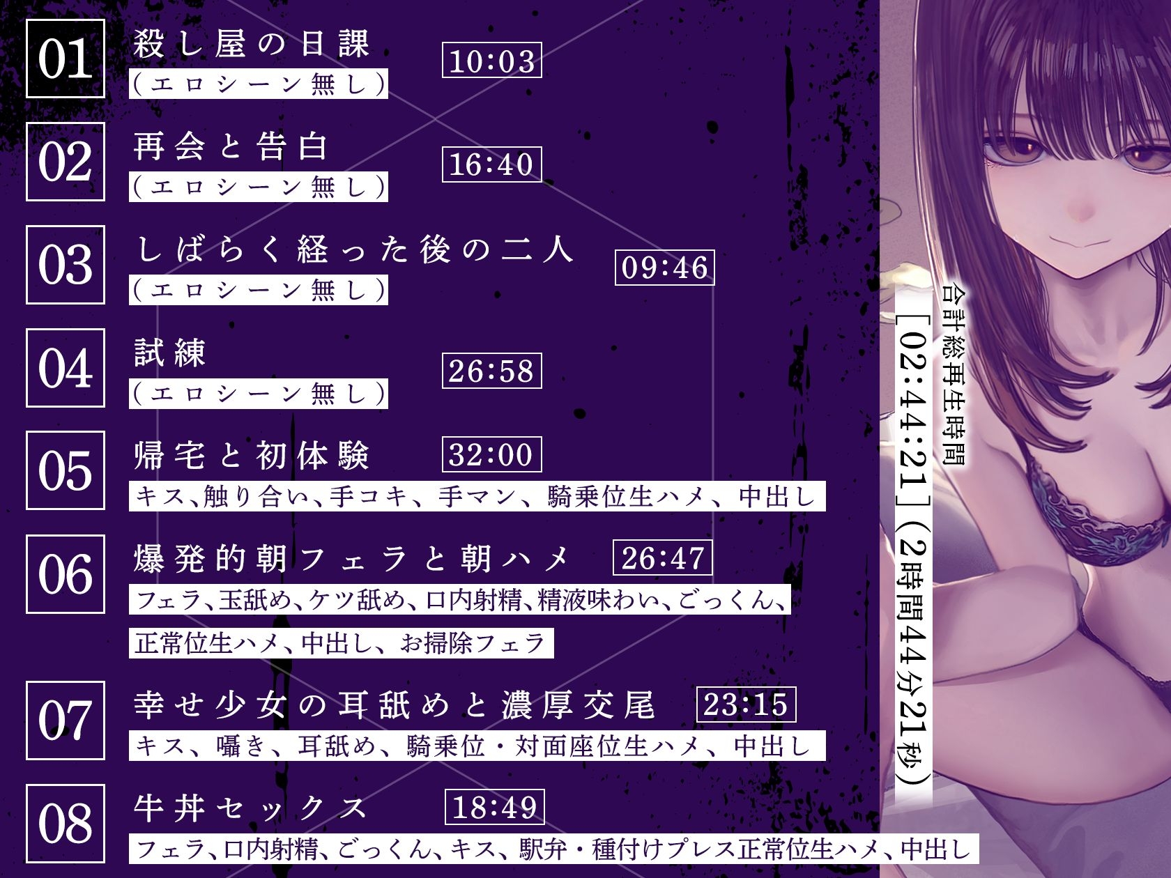 愛を知らなかった殺し屋少女が、主人公の一途な愛に触れ、愛されることの悦び・ 心を許せる関係の心地よさを知り、身も心も解き放たれていく。大好きな人と愛し合い体を重ねることに幸せを感じるようになり、今までの足りなかった愛を取り戻すかのように彼女は愛欲を求めるメスになっていく…。