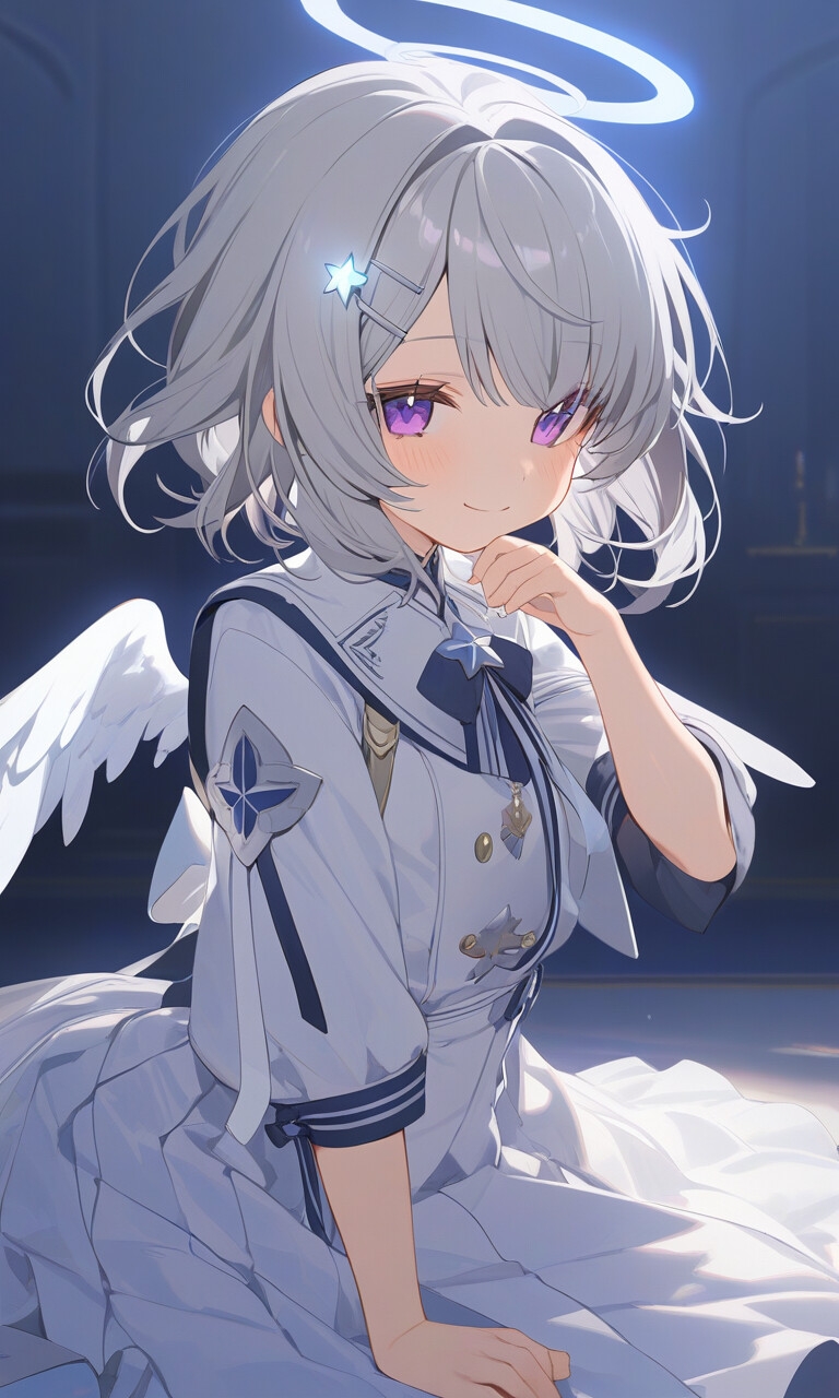 白銀の天使装束をまとい、薄いグレーに青みを帯びた髪を揺らす小柄な天使・星羽そら。
