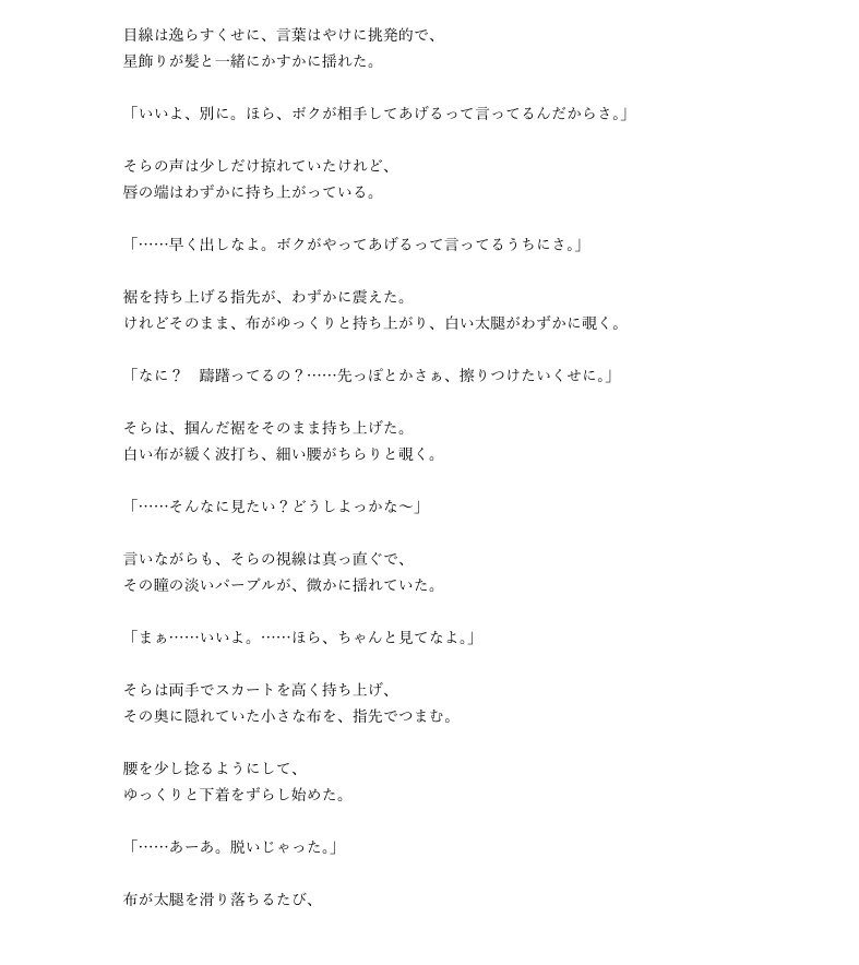 素股で煽り、擦りつけるだけで相手を翻弄しようとするそらだが、あふれ出す愛液と濡れた声は彼女自身の欲望を隠せない。