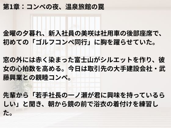 「夜○い出世、それは愛か、復讐か」──。新入OLの涙と蜜が、会社を飲み込む官能と野望の物語。美咲と一ノ瀬の愛と野望が、気持ちよく絡み合うハッピーエンドへ。浴衣の帯が解ける時、彼女の出世が加速する。19番ホールのルールはシンプルだ:「濡れて、勝て」。イラストはAIで生成しています。作品はほぼ文章で構成されています。