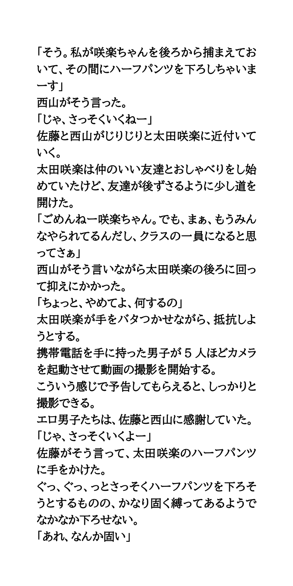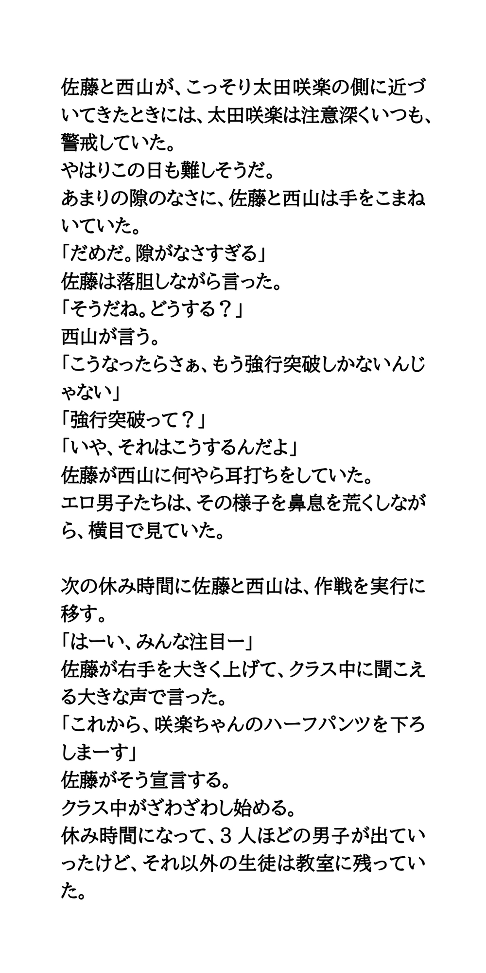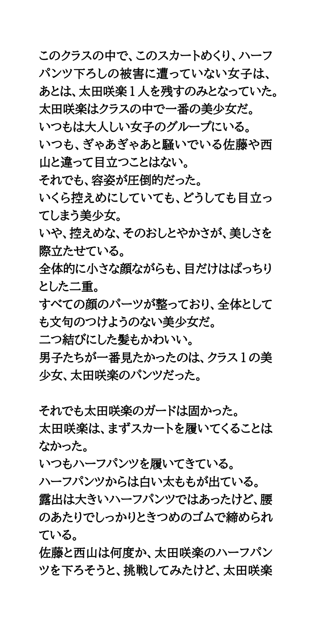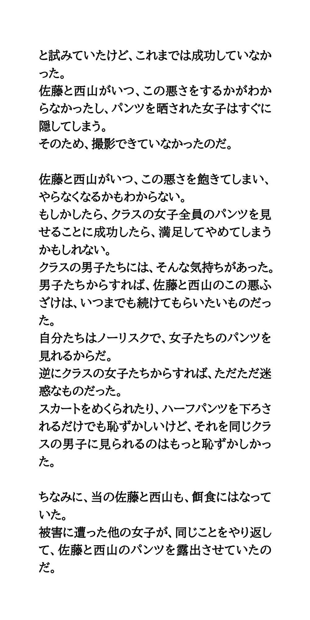 教室内で女子のパンツを露出させる悪ふざけが流行。ターゲットとなった女子がハーフパンツを脱がされる。そのとき、一緒にパンツも脱がされ、教室の中で下半身が晒け出されてしまう。