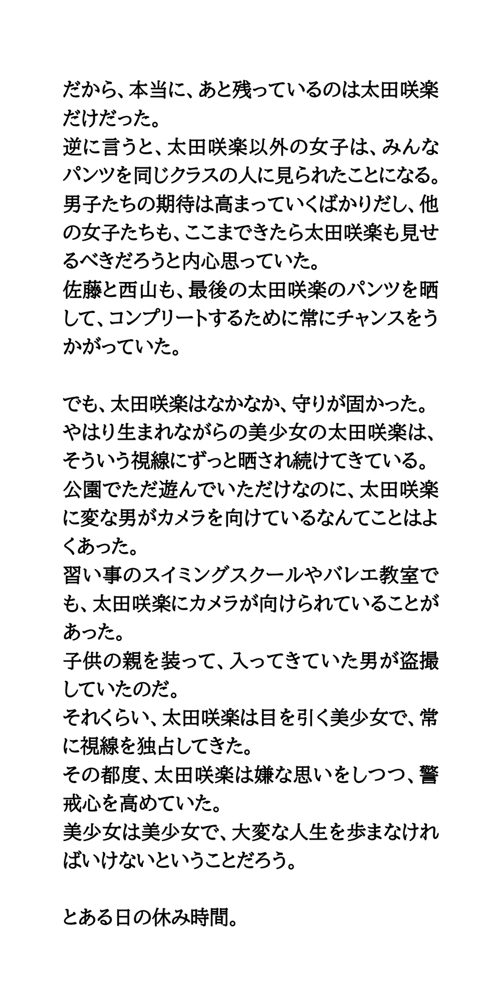 | タグ | お尻/ヒップ 少女 同級生/同僚 学校/学園 日常/生活 ノンフィクション/体験談 露出 羞恥/恥辱 |