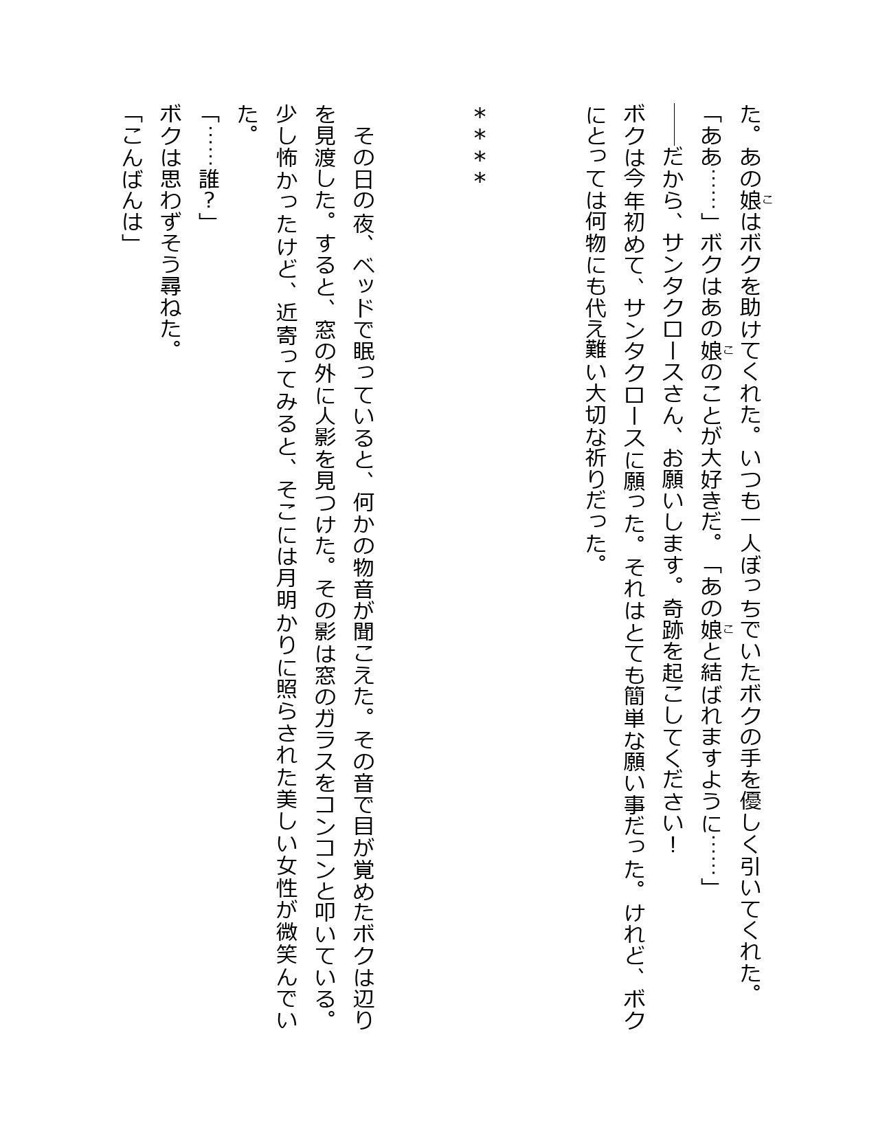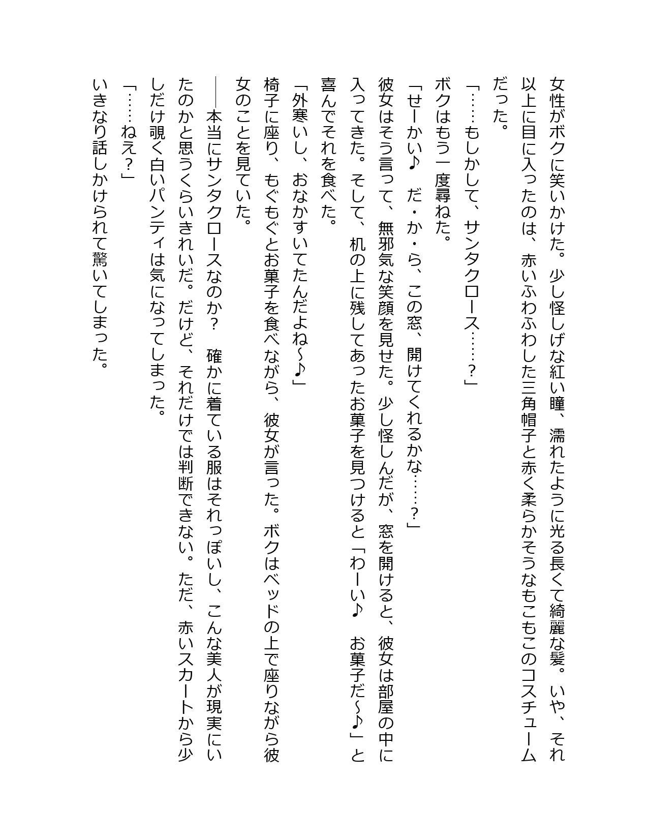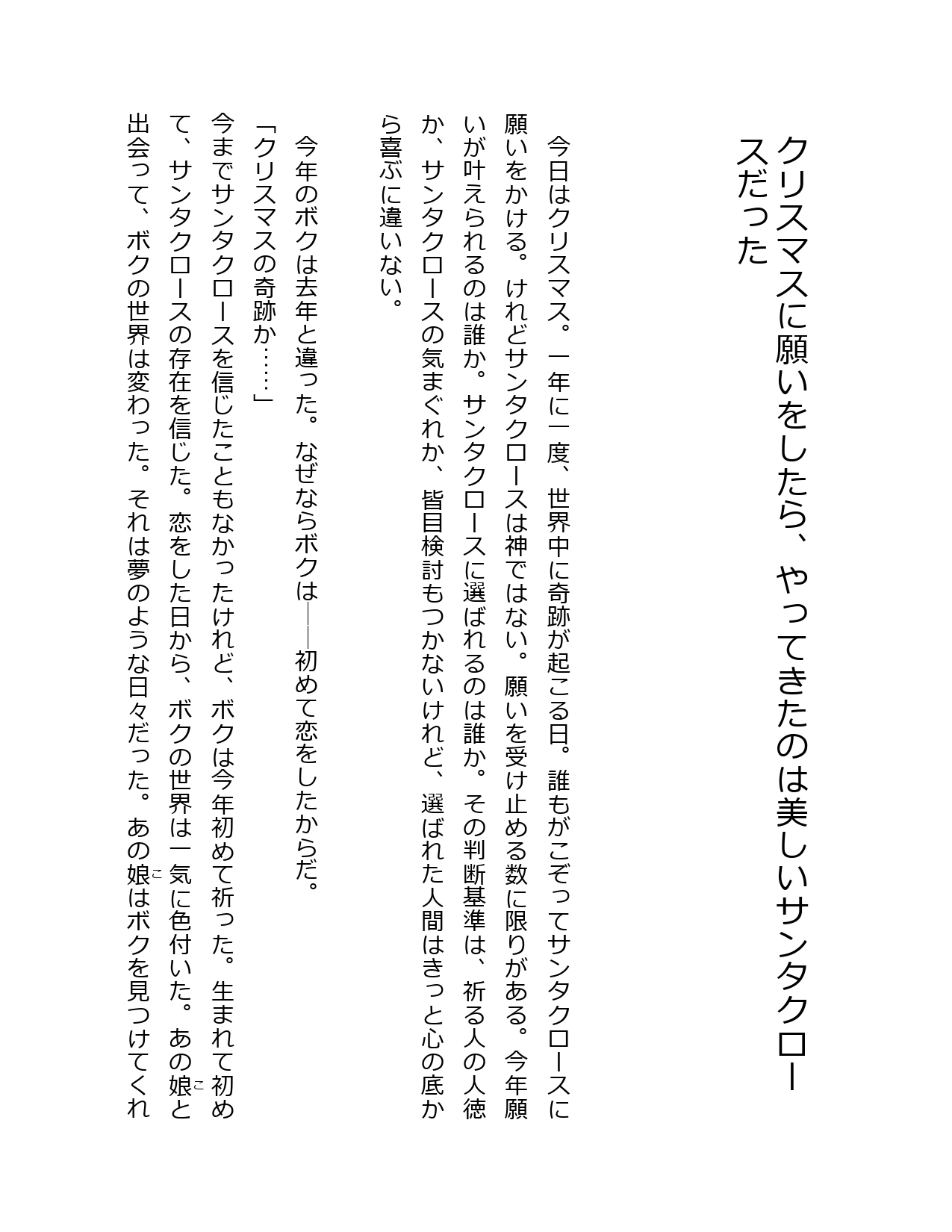塚原《つかはら》朔《はじめ》は人生で初めての恋をした。普段ならそんなことはしないのに、今年はサンタクロースに願った。それほど大きな恋だった。 「あの娘《こ》と結ばれますように……」 そしてクリスマスの夜、彼のもとにサンタクロースが現れた。けれど、その人はおじいさんではなく、美しい女の人だった。