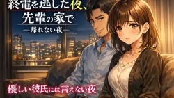 終電を逃した夜、彼氏がいるのに先輩の家に泊まることになったOL――静かな部屋で縮まる距離と揺れる心、抗えない一線の先に待つ“戻れない朝”…背徳と心理が絡み合う、大人のNTR一夜ストーリー。ダウンロード作品の内容続きを見る作品の説明【本作品の...